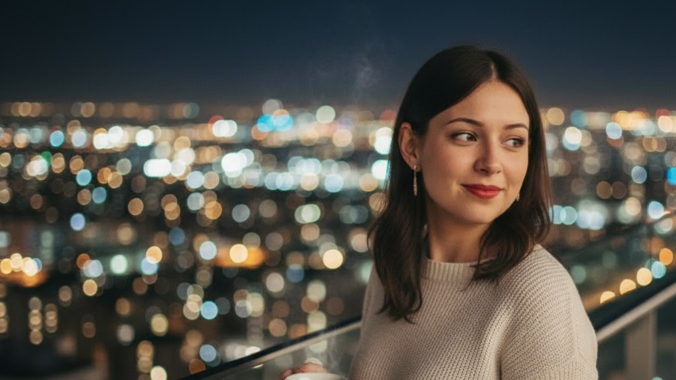 Cinematic portrait on a rooftop overlooking a bright city skyline at night. Soft bokeh lights, ultra-realistic, 8K quality, 85mm lens depth.