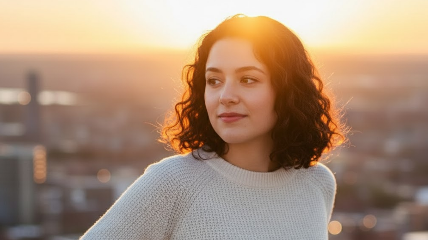 Corporate headshot on a rooftop during golden hour with warm blurred skyline, photorealistic and soft lighting.