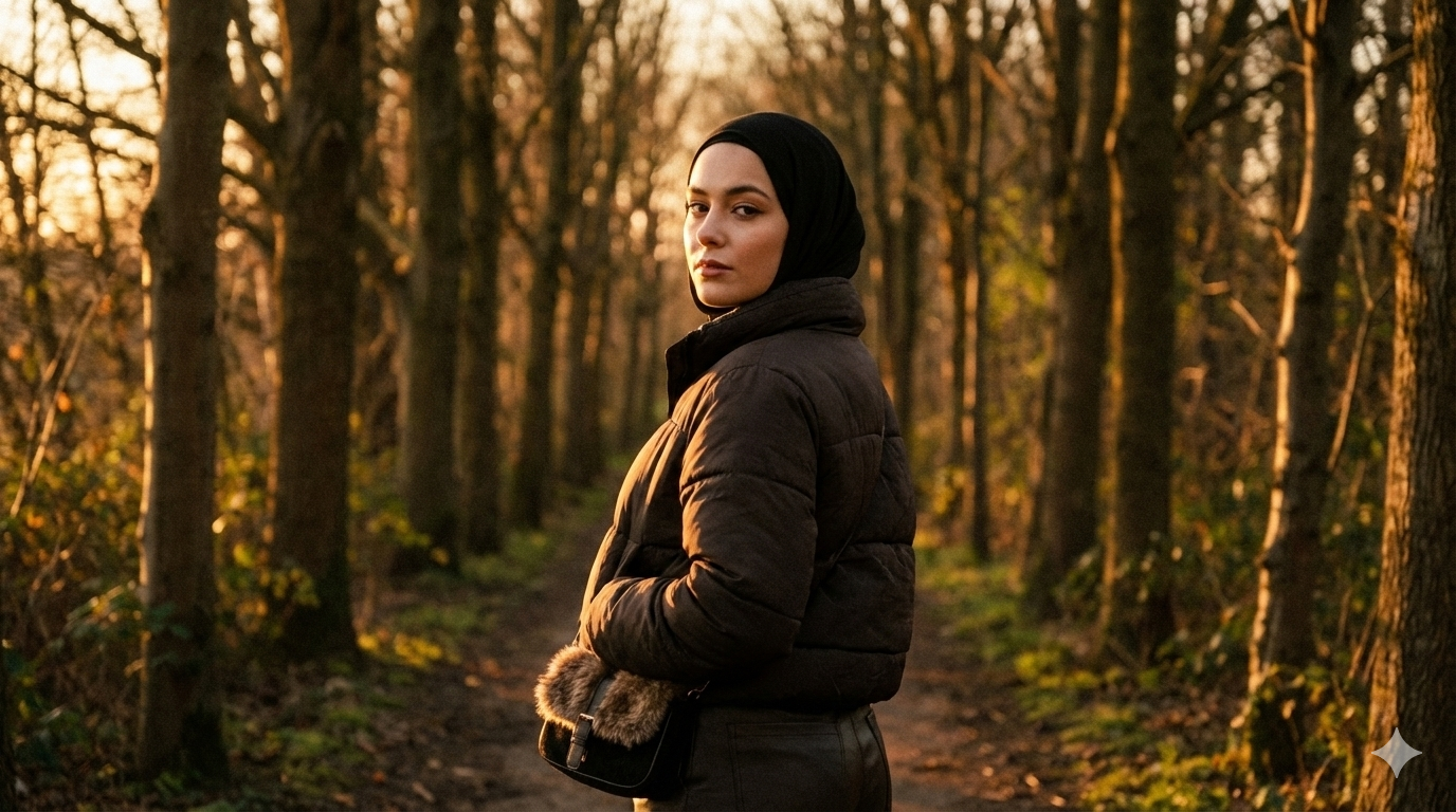 Gaya Y2K dengan sentuhan vintage. Cahaya matahari senja menembus dedaunan, berpadu dengan fashion puffer jacket dan hijab hitam rapi. Pose membelakangi kamera menciptakan kesan misterius.