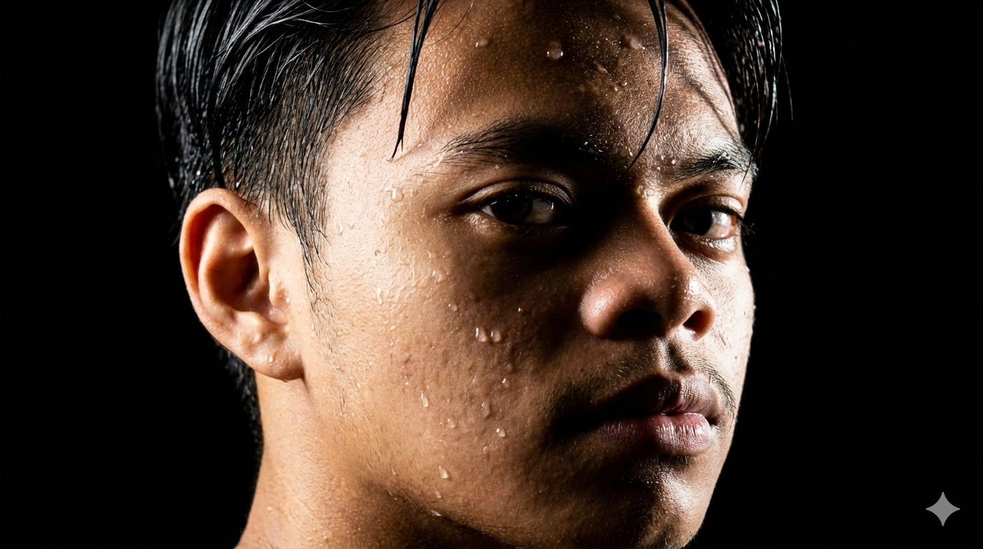 Konsep hiperreal dengan kontras tinggi, rambut dan wajah basah, serta latar gelap yang hanya menyorot wajah. Sangat cocok untuk pengguna yang menginginkan hasil artistik bergaya editorial.