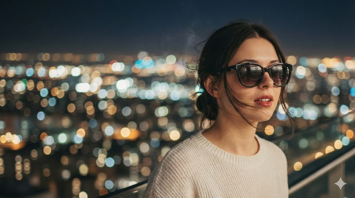 Masih dengan nuansa dreamy dan romantis, namun ditambah detail kacamata hitam yang memberi kesan chic dan stylish. Angin lembut yang menggerakkan rambut menambah efek sinematik.