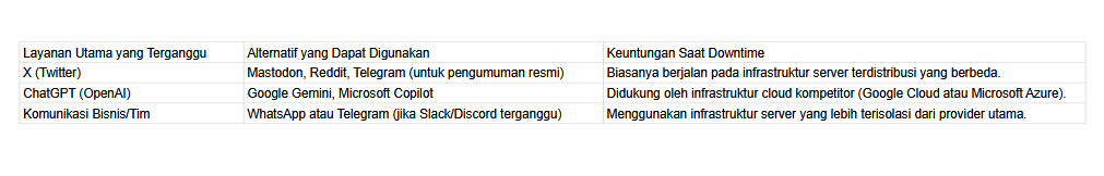 Saat platform terpusat seperti X atau ChatGPT down, penting untuk memiliki jalur komunikasi dan alat kerja cadangan yang mengandalkan infrastruktur berbeda: