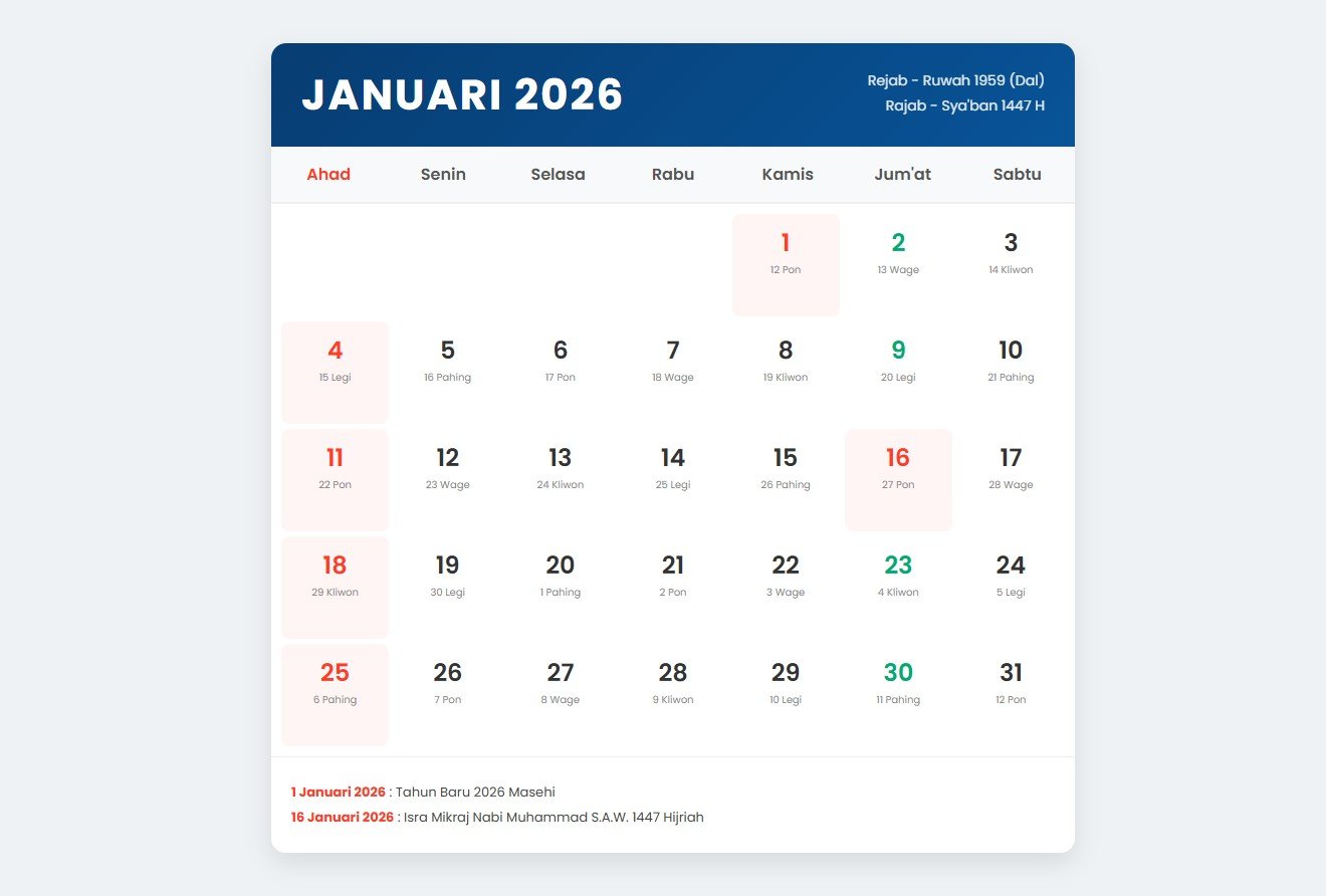 Berikut rangkuman konversi kalender Hijriah sepanjang Januari 2026: