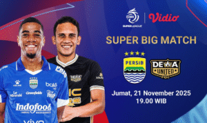 BeritaBandungRaya.com — Pertandingan pekan ke-13 Super League 2025/26 antara PERSIB Bandung vs Dewa United dapat ditonton melalui layanan live streaming Vidio, Jumat (21/11/2025) pukul 19.00 WIB. Laga yang digelar di Stadion Gelora Bandung Lautan Api (GBLA) ini menjadi salah satu duel yang paling ditunggu Bobotoh, terutama setelah Maung Bandung mencatat tiga kemenangan beruntun sebelum jeda internasional. Dengan atmosfer stadion yang selalu bergelora, laga ini diperkirakan menghadirkan tensi tinggi sejak menit awal.