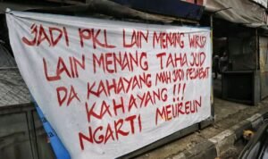 BeritaBandungRaya.com – Penolakan terhadap rencana pembangunan jalur Bus Rapid Transit (BRT) di kawasan Cicadas, Kota Bandung, mulai mengemuka. Sejumlah Pedagang Kaki Lima (PKL) yang berjualan di sepanjang Jalan Ahmad Yani menyuarakan keberatan mereka dengan memasang spanduk bernada protes di sekitar kios dan lapak dagangan.