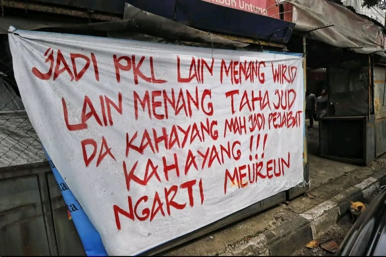 Salah satu spanduk berisi ungkapan bernada reflektif dalam bahasa Sunda yang telah diterjemahkan ke bahasa Indonesia. Isinya menyinggung perjuangan hidup pedagang kecil yang harus bertahan dalam kondisi serba tidak pasti. Spanduk lain secara gamblang menyoroti situasi perdagangan yang kian sepi sejak pandemi Covid-19, ditambah munculnya kabar pembangunan yang dinilai berpotensi memperburuk keadaan.