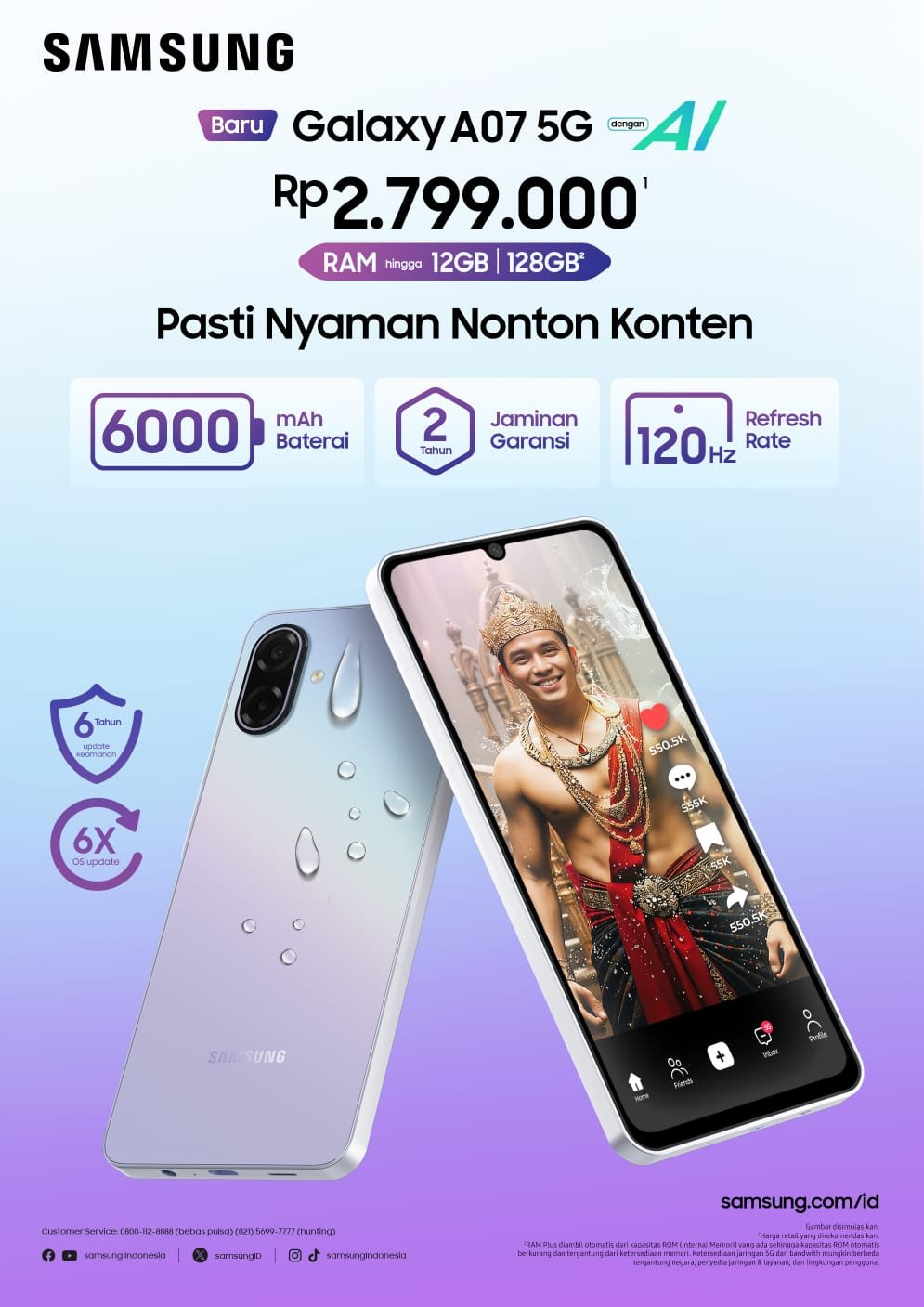 Di tengah meningkatnya penggunaan smartphone untuk scrolling media sosial, streaming video, hingga multitasking, Galaxy A07 5G hadir dengan layar 120Hz, baterai besar 6.000mAh, serta performa stabil untuk penggunaan sepanjang hari.