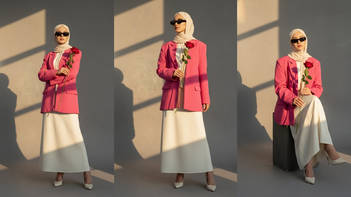“Edit foto ini menjadi duduk santai di studio foto dengan pantulan cahaya senja. Ia mengenakan blazer oversize warna pink, rok putih tulang, high heels putih tulang, serta jilbab putih tulang. Angle dari depan, gaya elegan dan edgy dengan nuansa misterius. Tangan memegang bunga tanpa mengubah wajah.”