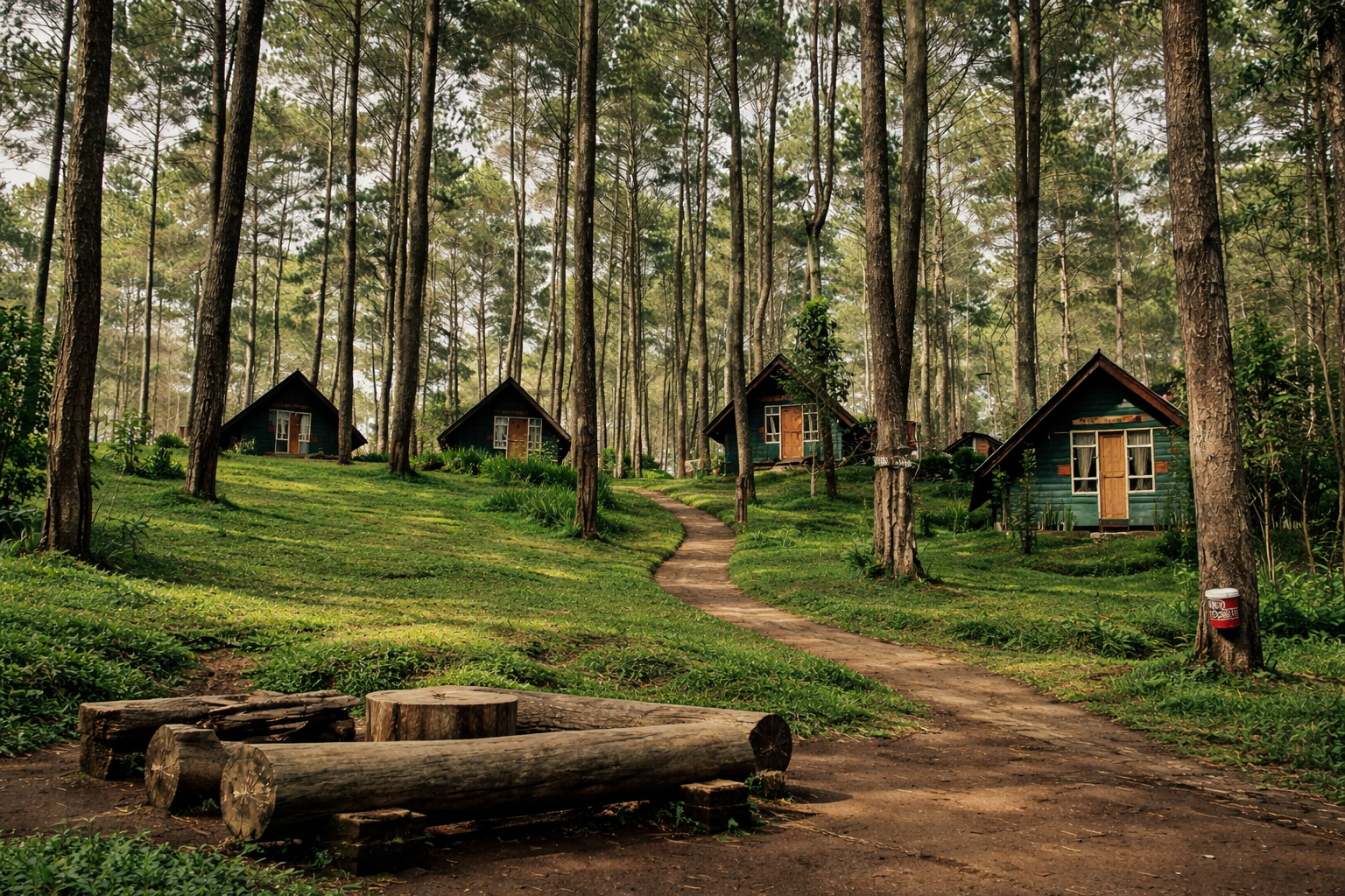 Deretan pohon pinus yang menjulang tinggi, kabut tipis di pagi hari, serta cahaya matahari yang menembus sela-sela pepohonan menciptakan suasana dramatis yang sulit ditemukan di perkotaan.